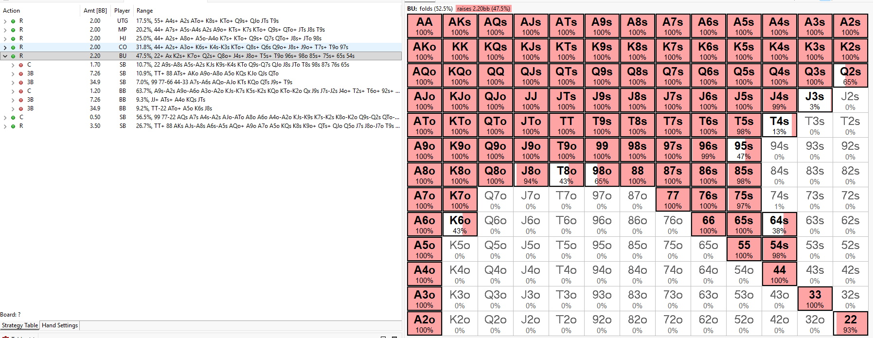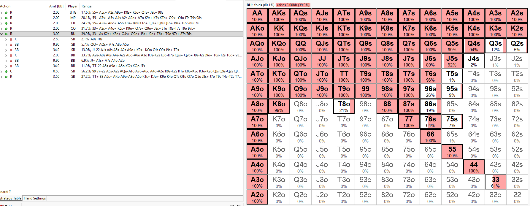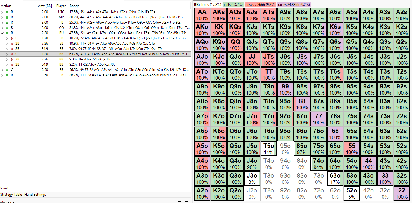 Back to Articles Big Blind Defense in Micro-Stakes MTTs March 11, 2026 Share Adjusting to Different Open Sizes One of the most common leaks in micro-stakes tournaments happens in the Big Blind. Many players either defend too wide regardless of the raise size or over-adjust and fold too much. The key to mastering Big Blind defense is understanding how Raise First In (RFI) sizes affect optimal strategy. In this guide we’ll break down how to construct your Big Blind defending range against different open sizes and explain how to adapt to the tendencies commonly seen in micro-stakes games. Common Mistakes in Micro Stakes Many micro-stakes players misunderstand how sizing influences ranges. This usually leads to two major mistakes: 1. Static Big Blind Defence Some players defend the same range regardless of open size. They ignore the price they are getting and the likelihood that the opener’s range changes with larger bets. 2. Over-adjustment Others go too far in the opposite direction. When facing a bigger raise they either: Under-defend and fold profitable hands, or Over-defend with weak hands against a stronger, often polarized range. The goal is not to abandon your strategy, but recalibrate it based on the conditions. The Scenario : A Simple Tournament Toy Game We examine a Button and Big Blind each at 35bb, as part of an equal stack 35BB model. The model makes use of four strategic options for the Big Blind; Fold, Call, raise 3.3x (the Big Blind RFI) and all-in. In a chip EV (cEV) environment the button generally should open to a size around 2.2bb at 35Bbb, opening 47.5% of the time. Other Raise First In sizes that are similar are equally appropriate as we will explore later. I.e. we would not expect significant strategy changes if our opponent makes it 2.1bb instead of 2.2bb. Below we can observe the shift in frequency for an open to 3x. The amount of hands the Button can open profitability to a larger size decreases to 39.9%. While it’s important to learn GTO preflop ranges for each position in order to understand the theoretical baseline, it’s equally important to recognize that most players in micro-stakes tournaments are not playing these ranges. The majority of the player pool is recreational and playing primarily for enjoyment, which means their decisions are rarely based on balanced strategies. As a result, although the models used in this article show balanced, equilibrium ranges for different RFI sizes, the reality at micro stakes is often quite different. Many players are not opening a wide, well-constructed range. Instead, their raises are frequently value-driven and heavily weighted toward stronger hands. Even when we suspect this is the case, it doesn’t mean we should automatically fold every marginal hand in the Big Blind. The Big Blind still benefits from strong pot odds and implied odds, especially when holding hands that can realize equity well in post flop situations. However, the key is balance. We want to avoid the common mistake of over-defending, where we continue with too many weak hands simply because we are getting a price. Consistently calling with marginal holdings against ranges that are stronger than expected will gradually bleed chips over time. The goal is to defend profitably—taking advantage of the odds when appropriate, while avoiding the trap of putting additional chips into the pot with hands that struggle to perform in the post flop game tree. #1 seller! Complete GTO Preflop Charts & Trainer Package All 900+ GTO solutions across every format Interactive Chart View + Range View + Trainer MTT, Cash, ICM, PKO, Hyper, Spin & Go — everything included 7-day free trial — cancel anytime $20.8/mo $25/mo Billed annually Best Value Billed monthly More detailsAdd to cart Defending vs a 2BB Open A 2BB open is typically used at very short stack depths (around 25BB or less). Because the Big Blind has already posted 1BB, calling a min-raise requires very little additional investment. This gives the Big Blind excellent pot odds, allowing for a very wide defence. Key adjustments: Defend extremely wide Defend any Ax Kx Qx vs steal positions Mix in polarized 3-bets Polarised Big Blind Raises When raising from the Big Blind at standard stack depths, theory suggests a polarised strategy. This concept is often referred to as blocker-based duplication in range construction. Value hands; strong hands that dominate the opponents calling range and want to build the pot pre-flop (e.g. AA, KK, QQ, AK) Offset bluffs; that duplicate our value, block our opponents value and unblock folds at the bottom of their opening range (e.g. 3bet bluffing A3o, J7o, T7o make IP fold A5o, J8o, T9o) Defending vs 2.2BB ‘GTO’ Opens At around 35BB stack depth, a 2.2BB open is generally considered optimal. From a practical standpoint, players should treat 2.1BB–2.3BB as essentially the same size. Population tendencies often dictate these differences rather than strategy. In reality the expected value and pot odds are virtually unchanged by such smaller variations in sizing. For example: One player may always click 2.1BB Another may default to 2.3BB But both might be opening identical ranges, so avoid over-adjusting to tiny sizing differences. Treat these sizes as standard opens and defend using your normal Big Blind strategy relative to the position and the effective stack depth on the table. Further Reading Preflop Strategy in Tournament Poker → Extreme ICM Bubble Strategy → Complete Guide to Bubble Strategy → Blind vs Blind Guide → Share Related articles Poker BBZ’s Complete Guide to Final Tables March 6, 2026 Read more Poker How ICM Changes Your Continuation Bet Strategy March 3, 2026 Read more Poker No-Limit Holdem Training: The Complete Beginner’s Guide March 3, 2026 Read more