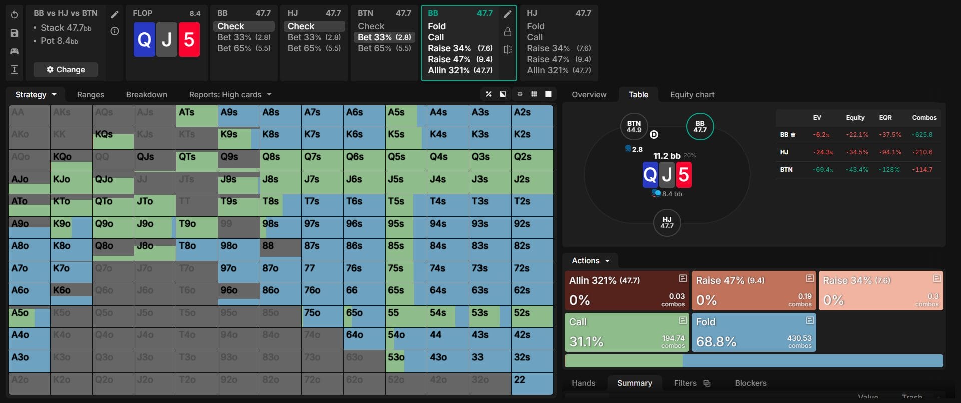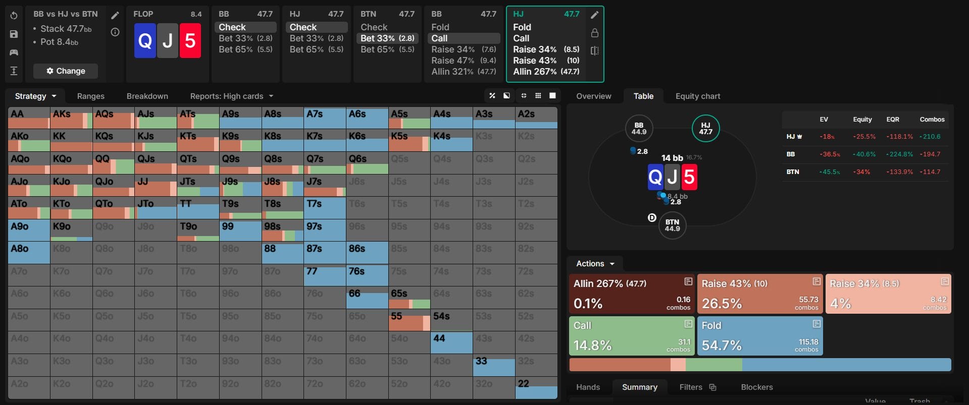 Back to Articles How to Play Multiway Pots in Tournament Poker March 21, 2026 Share How to Play Multiway Pots in Tournament Poker Multiway pots are among the most misunderstood situations in tournament poker. When three or more players see a flop, betting and defending strategies shift dramatically compared to heads-up play. Strategies that work in two-player pots frequently fail in multiway situations because additional opponents change who bets, how often they bet, and what hands they want to bet with. This guide focuses on the flop and breaks down foundational multiway pot strategy you can put to work immediately — who does the betting, how often, and why. It also covers nuances specific to these spots: how sandwiched players should respond, and why overcalling is usually weaker than squeezing. The In-Position Player Runs Multiway Pots In multiway pots, an additional player is present whose range is stronger than the big blind’s preflop range. As a result, the opener’s checking frequency rises relative to heads-up play. Range betting becomes far less viable. Trapping in position is also less attractive on many boards when two opponents can outdraw you, while checking strong hands out of position still carries a viable payoff — players in position will bet into you, setting up the check-raise on a wide range of textures. On a Q-J-5 Rainbow flop in a three-way pot between the big blind, hijack, and button, the big blind checks range and the hijack checks roughly 45% of the time. The button bets approximately 55% — close to average across most flop textures in this configuration. When the button bets, nearly all of its strongest hands are in that range, along with a large share of medium-strength holdings. When the button checks, the range is capped and relatively weak. The button pure-bets sets and two pair, but also bets a large fraction of bottom pair. Bottom pair on this texture functions as a blocker to strong hands and a backdoor two-pair draw — closer to a thin bluff than a value bet. In heads-up play, most bottom-pair hands would check back rather than bet in a mixed strategy. BTN betting range on Q♦J─5♥ in a BB vs HJ vs BTN three-way pot at 50 big blinds. The button bets 33% pot the majority of the time. Nearly all strong hands are in the betting range. Source: BBZ Poker Charts. Key Takeaway In multiway pots, the in-position player bets roughly 50 to 60 percent of the time and concentrates nearly all of its strength in the betting range. The checking range is capped and vulnerable. This is one of the most important structural differences between multiway and heads-up play on the flop. Medium-Strength Hands Become Bets In a heads-up pot, checking back a medium-strength hand on the flop is often correct. You have decent showdown value, and one opponent can only outdraw you in one place. In multiway pots, that logic breaks down. With two or more opponents still in the hand, the probability that at least one of them improves on the turn or river increases substantially. A hand like bottom pair with a decent kicker might hold reasonable equity against a single opponent, but against two, the chance someone outdraws you by the river is much higher. Checking and hoping to reach showdown becomes increasingly unattractive. Rather than checking and allowing multiple opponents free cards, a small bet charges draws and weaker holdings while functioning as a semi-bluff when your hand has equity but is unlikely to win unimproved. Blocker value also rises in multiway pots — ranges are stronger and narrower, so by the river after barreling the flop and turn, bottom pair frequently blocks the strongest parts of the calling range: sets, two pair, and top pair strong kicker combos. Strategy Tip When you are in position in a multiway pot, do not default to checking back medium-strength hands simply because they have showdown value. Consider how likely the hand survives against multiple opponents across two more streets. When the answer is uncertain, betting small is often as good or better than checking. Sandwiched Players: Call? Fold? One of the most consequential dynamics in multiway pots is what happens to players caught between the bettor and one or more opponents who have not yet acted. The classic case is the big blind in a three-way pot where the button bets. In a heads-up pot, the big blind can call, raise, or fold with only the button’s range to consider. In a multiway pot, the big blind must also account for the hijack still behind. If the big blind calls, the hijack can still raise. The big blind is sandwiched. The sandwiched player has to respect the nut ratio of the player left to act. Raising when a live opponent is behind exposes you to a potential squeeze from a stronger range, and in ICM situations the cost of elimination adds further pressure against raising. The practical result is a near-pure call-or-fold strategy. On Q♦J─5♥ facing a button bet, the big blind folds approximately 69% of the time and calls roughly 31%. Raising frequency across all sizes is essentially zero. That is not an exploitable tendency — it is the structurally correct response to being sandwiched. BB facing a BTN bet on Q♦J─5♥ in a three-way pot at 50 big blinds. The big blind folds approximately 69% and calls approximately 31%. Raising is nearly nonexistent across all raise sizes. Source: BBZ Poker Charts. Small Bets Dominate Multiway Flops Betting too large is one of the most common mistakes in multiway pots. In a heads-up pot, 66% or 75% pot is standard on many flop textures. In multiway pots, correct sizing is almost always smaller. A 33% pot bet is sufficient on most multiway boards. At that sizing, each opponent needs to fold roughly half their range — substantial fold equity and protection in exchange for a minimal risk. There is a deeper structural reason for small sizing. In multiway pots, two opponents potentially hold the nuts. One of the most reliable relatio