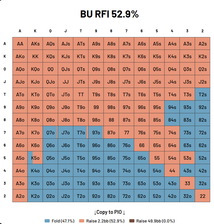 Back to Articles GTO Charts Explained: How to Read and Use Preflop Range Charts March 22, 2026 Share GTO preflop charts are the most practical tool in a tournament poker player’s study arsenal. Most players have heard the term but have never used a real chart set, relying instead on rough approximations or outdated ranges that cost them chips every session. The Basics A GTO chart is a visual representation of a game theory optimal preflop strategy for a specific position, stack depth, and tournament format. The output is a 13×13 matrix covering all 169 possible starting hand combinations. Each cell shows what action a GTO strategy takes with that hand: fold, call, raise, or go all-in. When a hand takes more than one action at equilibrium, the cell displays mixed colors showing the proportion of each. GTO stands for game theory optimal. A GTO strategy is one that cannot be exploited by any opponent adjustment. If you deviate from it, a sufficiently skilled opponent can identify and punish that deviation for a profit. GTO charts are derived by running game tree solvers through millions of iterations until each player’s strategy converges on an equilibrium where neither side can improve by changing actions unilaterally. A GTO chart is not a list of good hands. It is a precise, frequency-based strategy that accounts for the full structure of the situation: who is left to act, how likely each player is to call or 3-bet, what the pot geometry looks like at each stack depth, and how hands interact with postflop boards. A hand that is a clear open from the button may be a fold under the gun for these exact reasons. If you are new to reading hand matrices, our Complete Beginner’s Guide to No-limit Hold’em training covers the foundational concepts before you work with chart data. Position is Everything Position is the most important variable in a preflop GTO chart, and the difference between positions is far larger than most players expect. At 50 big blinds in a multi-table tournament, our range data shows under the gun opening roughly 19% of hands. The button opens closer to 55%. That gap does not reflect tight versus loose tendencies. It reflects a fundamental structural difference in how each position interacts with the table. Under the gun must act first with six or more players still to act behind. Each player behind has a chance to 3-bet or flat call, and the UTG player will be out of position against most of the table for the rest of the hand. These structural penalties require a tighter, stronger range to compensate. Only hands that perform well under those conditions earn a place in the UTG opening range. The button faces a completely different situation. Only the small blind and big blind remain to act, and the button will be in position against both of them on every postflop street. That positional advantage makes a broad range profitable. Hands that cannot sustain postflop pressure out of position become viable on the button because you can realize equity through continued aggression and well-timed folds with the best available information. Stack Depth Is a Separate Variable Stack depth is the second major variable in GTO preflop charts, and it compounds with position to produce a large matrix of distinct strategies. A correct chart set for tournament poker covers multiple stack depths, typically ranging from 10 or 15 big blinds through 100 big blinds, because the equilibrium strategy at 20 big blinds is materially different from the strategy at 50 big blinds. At deeper stacks, players have more postflop streets to work with and considerably larger pots to contest. A hand’s value at depth depends on two related factors: its ability to realize equity across multiple streets, and its nut-making potential. Suited connectors and strong Broadway combinations gain value at depth precisely because they make the nuts. Hands that make second-best holdings are vulnerable to exactly the kind of large, multi-street pressure that deep stacks enable. At shorter stacks, the postflop game is compressed or eliminated entirely. At 20 big blinds, many hands face a choice between open-jamming and folding, with only a narrow raise-small range available for hands strong enough to profit from it. Raw equity against calling ranges takes over as the primary driver. This is why A9 offsuit open-jams at 15 big blinds but would never jam at 40 big blinds, where a small raise is far more profitable. Stack depth is particularly important in tournament poker, where your effective stack changes every level and every elimination. A chart set that covers only 50 to 100 big blinds leaves you without guidance for the 20 to 40 big blind range that represents a substantial portion of every tournament session. How to Read a GTO Poker Chart: Colors and Mixed Strategies A GTO chart uses color to encode action. The standard convention assigns a distinct color to each possible action: one color for fold, one for raise small, one for open-jam, and one for call or limp. The diagonal of the 13×13 matrix represents pocket pairs, the upper-right triangle represents suited hands, and the lower-left triangle represents offsuit hands. This layout lets you scan the chart and immediately identify which hand types are playable and from which section of the matrix opens are drawn. Many hands in a GTO preflop chart show mixed colors rather than a single pure action. A cell that is half raise and half fold indicates that the hand takes each action at approximately equal frequency in the GTO strategy. This is not indecision or a chart error. Mixed strategies exist in equilibrium because a pure strategy on certain hands would be exploitable: if you folded a specific hand at 100% frequency, an observant opponent could adjust to take advantage of that pattern. Mixing keeps your ranges balanced and harder to counter. At the table, you do not need to flip mental coins on mixed hands. The value of understanding mixed strategies is that t