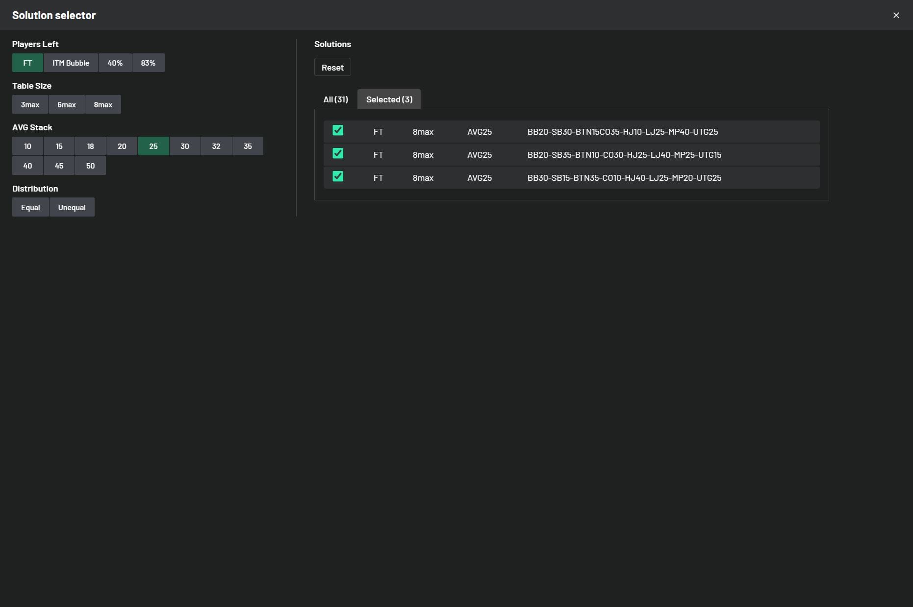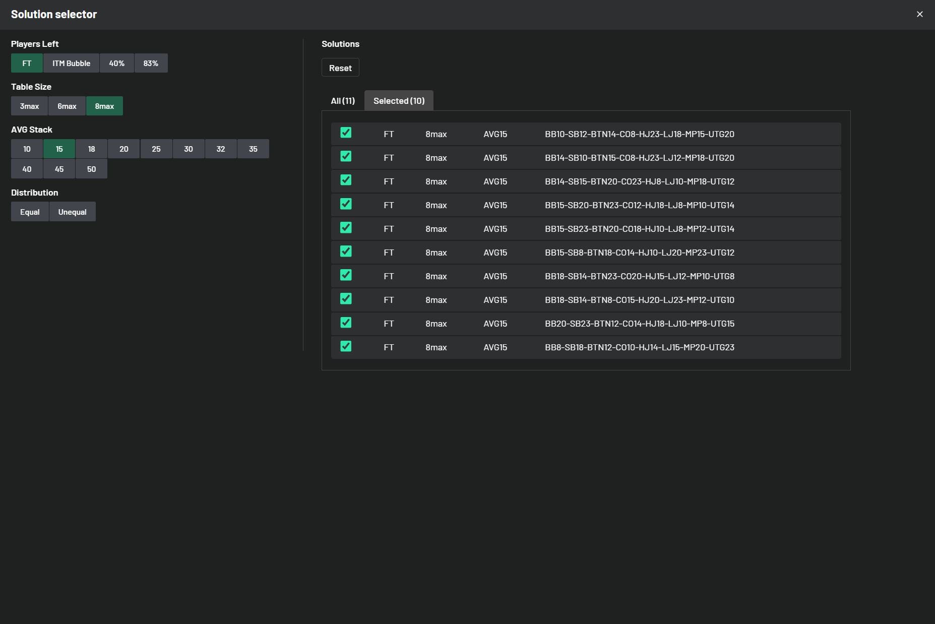 Back to Knowledge Base Update: ICM Solutions August 2, 2024 | Randar Sikk Share We are delighted to announce an update aimed at enhancing your experience. We’ve expanded the range of ICM solutions available for learning in Range Viewer and practicing in Trainer. ICM Solutions 23 new 8-max Final Table solutions have been added, expanding our collection to 236 solutions, including Early Stage, Bubble Play, In The Money, and Final Table solutions. All new ICM Final Table solutions come with unequal stack distributions. We’ve remained committed to our goal of covering a wide range of solutions with unequal stack sizes. New solutions with Unequal Stack Distributions: 3 New Different 8max Solutions with average stack size 25bb 10 New Different 8max Solutions with average stack size 20bb 10 New Different 8max Solutions with average stack size 15bb Take a quick peek below to see how these stacks are distributed: Final Tables! ICM Preflop Charts & Trainer 254 Different ICM solutions (Final Table, ITM, Pre-ITM, ITM Bubble, Satellites) Chart View Range View Trainer Cancel at any time $10.6/mo $15/mo Billed annually 15% OffBest Value Billed monthly More detailsAdd to cart Share Related articles Poker When They C-Bet Too Much November 19, 2025 Read more InterviewsNewsPoker BBZ Student Alexion7’s Rise from Micro-Stakes to Poker Pro October 17, 2025 Read more Poker The Truth About Variance in MTTs: Lessons from BBZ’s Toy Game October 7, 2025 Read more