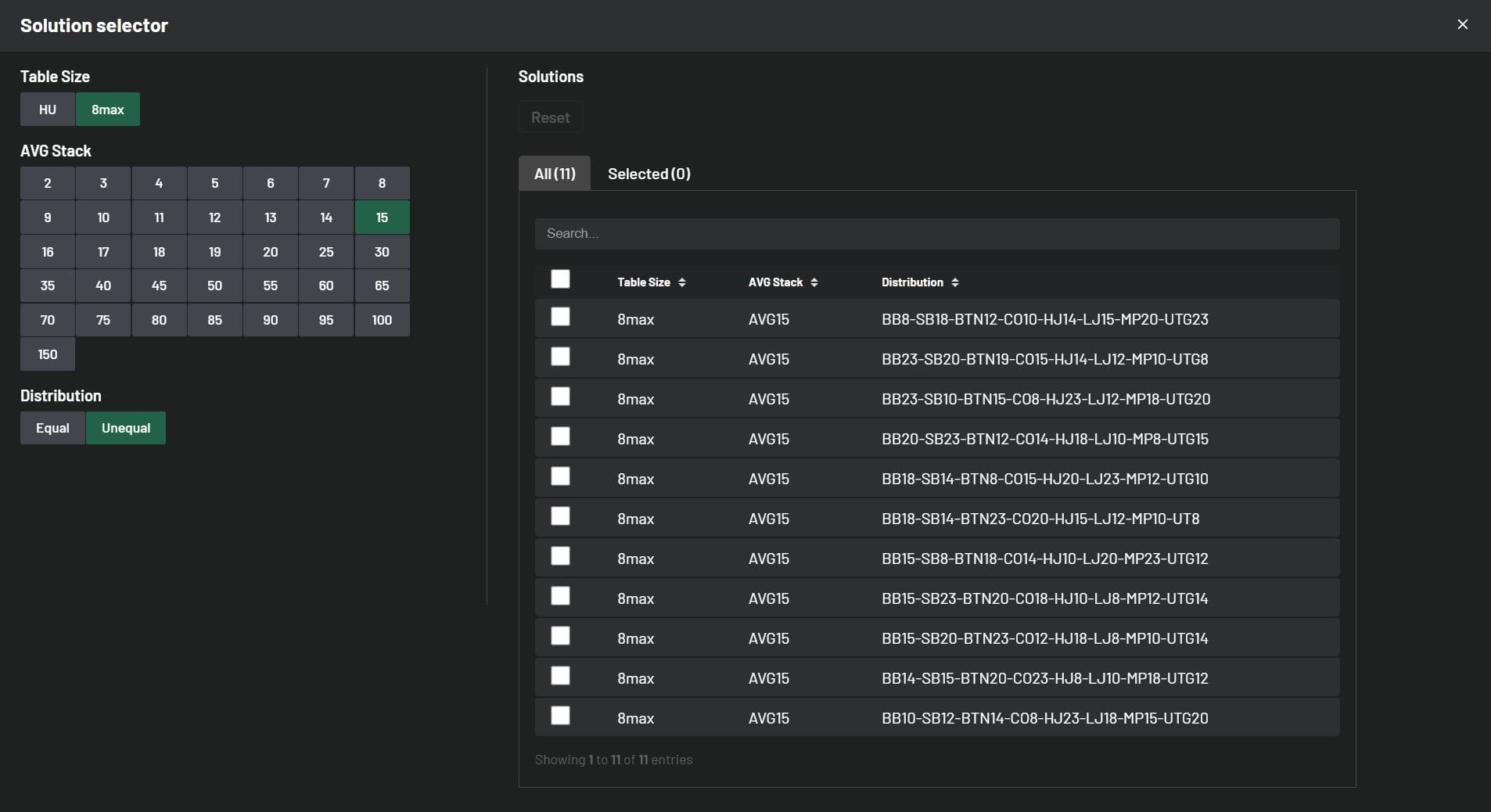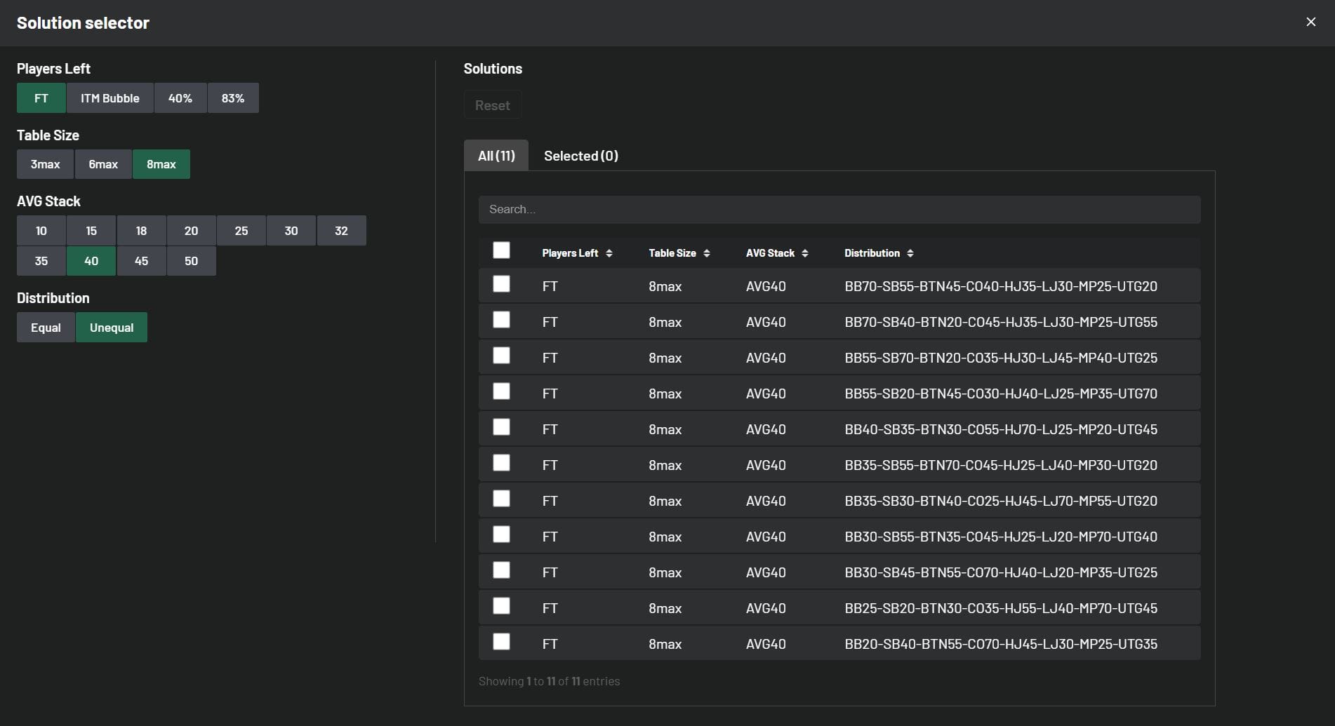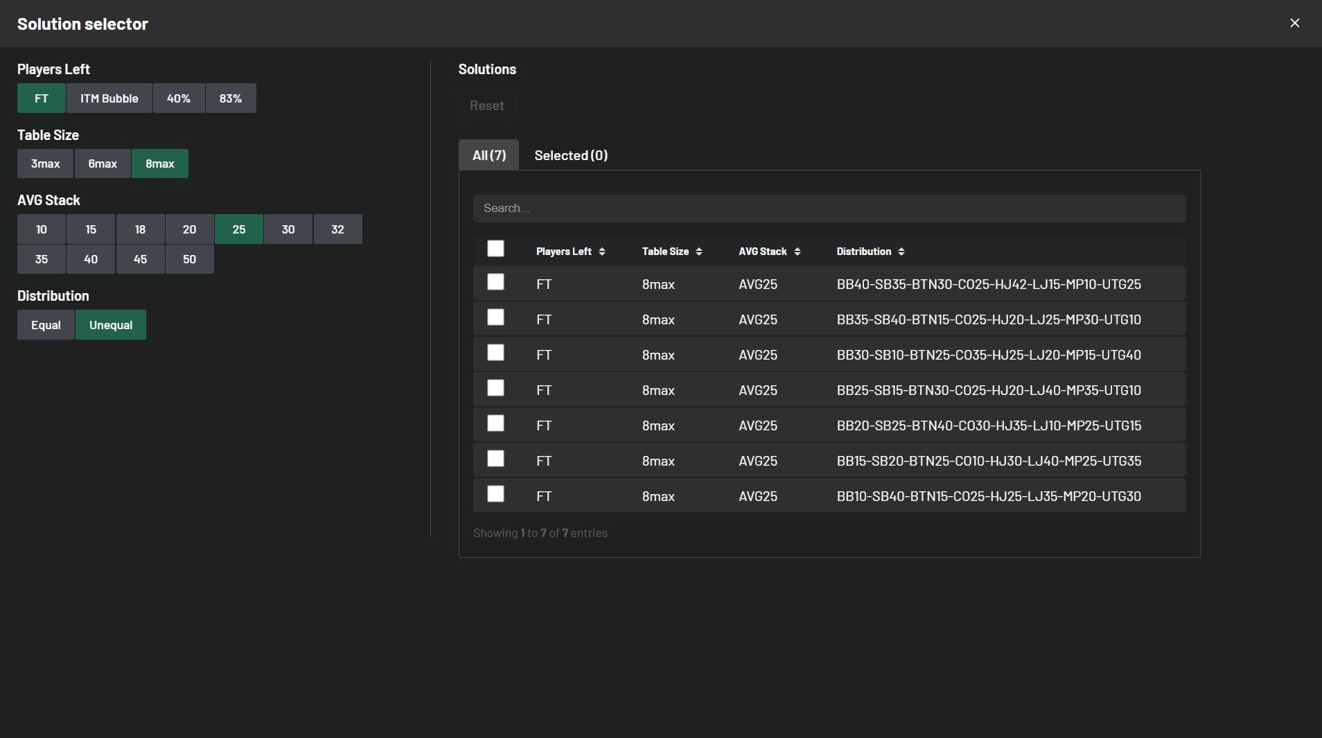 Back to Knowledge Base Update: Solutions and Improvements June 5, 2024 | Randar Sikk Share It’s time to showcase our latest updates designed to enhance your learning experience. We’ve made improvements to our MTT solutions by incorporating both ChipEV and ICM models. We’ve made a few changes based on your feedback regarding features. Additionally, we’ve been working behind the scenes to improve your learning experience, and we’re excited to deliver these updates to you in the near future. Stay tuned! ChipEV Solutions 14 new 8-max ChipEV solutions have been added, expanding our collection to 109 solutions, including both 8-max and Heads-Up formats. We’ve remained committed to our goal of covering a wide range of solutions with unequal stack sizes. New solutions with Unequal Stack Distributions: 11 New Different 8max Solutions with average stack size 15bb 3 New Different 8max Solutions with average stack size 40bb Take a quick peek below to see how these stacks are distributed: ICM Solutions 29 new 8-max Final Table solutions have been added, expanding our collection to 197 solutions, including Early Stage, Bubble Play, In The Money, and Final Table solutions. All new ICM Final Table solutions come with unequal stack distributions. Now you have the opportunity to learn how your decisions change at the beginning of the Final Table with unequal stacks compared to equal stack distributions. New solutions with Unequal Stack Distributions: 7 New Different 8max Solutions with average stack size 25bb 11 New Different 8max Solutions with average stack size 30bb 11 New Different 8max Solutions with average stack size 40bb Take a quick peek below to see how these stacks are distributed: Updates to Improve your Trainer Experience Replay Mistakes Mode We’ve supercharged our Replay Hands Mode, bumping it up from 10 hands per session to a whopping 99 hands in one go! So, here’s the deal: if you’ve got more than 99 hands to tackle, just knock out 99 in a session. Feeling ambitious? Start another session for more. And if you’ve got fewer than 99 hands, no sweat – you can breeze through them all in a single session. GTO / Full Toggle in Hero Range Toggle is a useful tool in scenarios where the range is narrow and there are many hand combinations used with very low frequency. Switching from GTO to Full makes it easier to identify your whole range, especially in mobile view. Now you have the option to toggle your strategies during your training session in Hero Range View. #1 seller! Complete Charts & Trainer Package Access to All Preflop Charts and Trainer Solutions Chart View Range View Trainer Cancel at any time! $17.7/mo $25/mo Billed annually 15% OffBest Value Billed monthly More detailsAdd to cart Share Related articles Poker When They C-Bet Too Much November 19, 2025 Read more InterviewsNewsPoker BBZ Student Alexion7’s Rise from Micro-Stakes to Poker Pro October 17, 2025 Read more Poker The Truth About Variance in MTTs: Lessons from BBZ’s Toy Game October 7, 2025 Read more