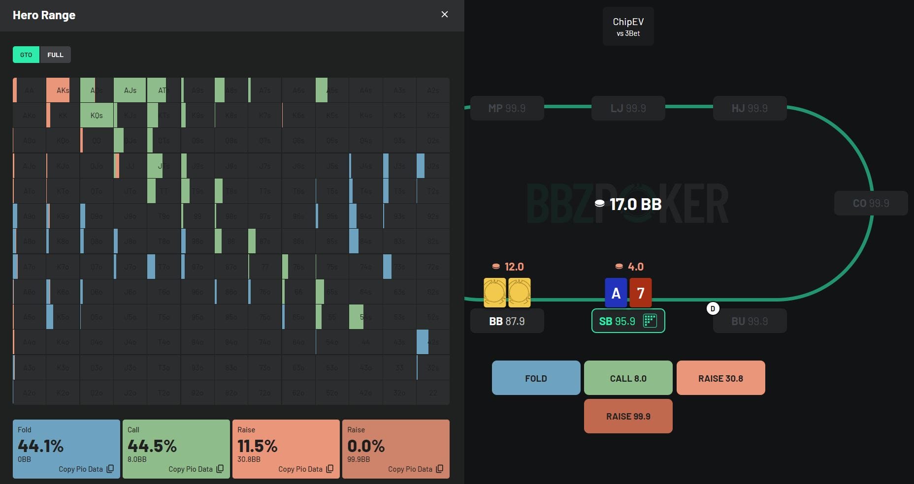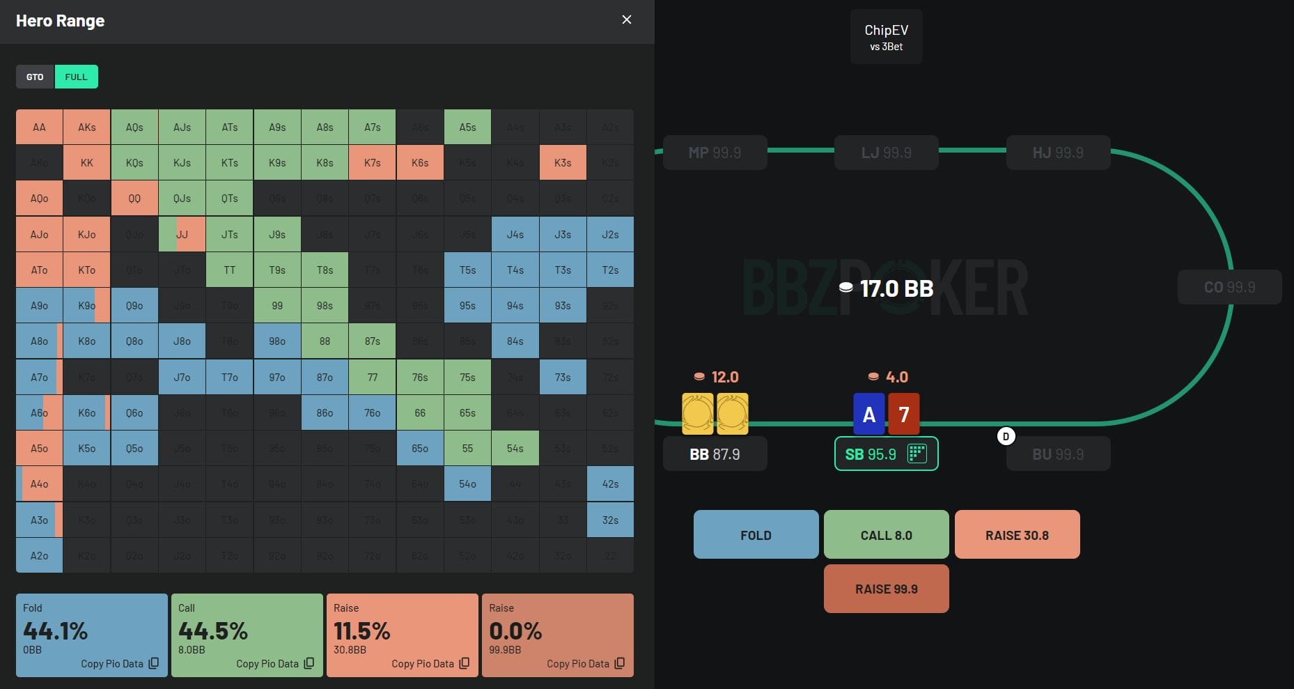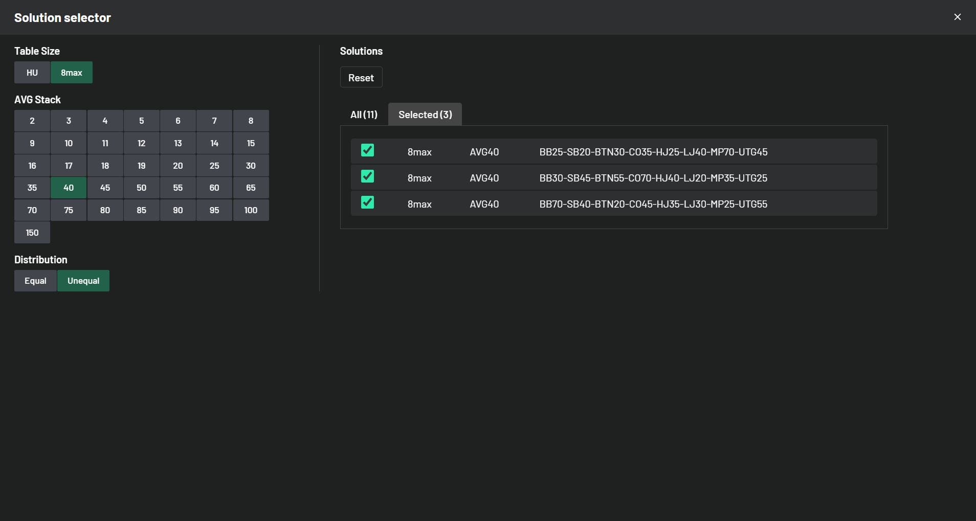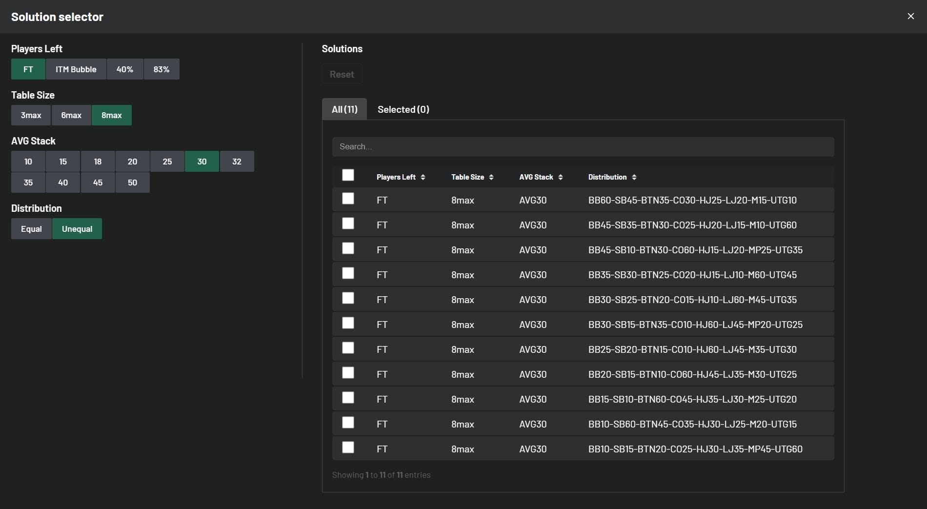 Back to Knowledge Base Update: Solutions and Improvements June 5, 2024 | Randar Sikk Share It’s time to showcase our latest updates designed to enhance your learning experience. We’ve made improvements to our MTT solutions by incorporating both ChipEV and ICM models. We’ve made a few changes based on your feedback regarding features. Additionally, we’ve been working behind the scenes to improve your learning experience, and we’re excited to deliver these updates to you in the near future. Stay tuned! ChipEV Solutions 14 new 8-max ChipEV solutions have been added, expanding our collection to 109 solutions, including both 8-max and Heads-Up formats. We’ve remained committed to our goal of covering a wide range of solutions with unequal stack sizes. New solutions with Unequal Stack Distributions: 11 New Different 8max Solutions with average stack size 15bb 3 New Different 8max Solutions with average stack size 40bb Take a quick peek below to see how these stacks are distributed: ICM Solutions 29 new 8-max Final Table solutions have been added, expanding our collection to 197 solutions, including Early Stage, Bubble Play, In The Money, and Final Table solutions. All new ICM Final Table solutions come with unequal stack distributions. Now you have the opportunity to learn how your decisions change at the beginning of the Final Table with unequal stacks compared to equal stack distributions. New solutions with Unequal Stack Distributions: 7 New Different 8max Solutions with average stack size 25bb 11 New Different 8max Solutions with average stack size 30bb 11 New Different 8max Solutions with average stack size 40bb Take a quick peek below to see how these stacks are distributed: Updates to Improve your Trainer Experience Replay Mistakes Mode We’ve supercharged our Replay Hands Mode, bumping it up from 10 hands per session to a whopping 99 hands in one go! So, here’s the deal: if you’ve got more than 99 hands to tackle, just knock out 99 in a session. Feeling ambitious? Start another session for more. And if you’ve got fewer than 99 hands, no sweat – you can breeze through them all in a single session. GTO / Full Toggle in Hero Range Toggle is a useful tool in scenarios where the range is narrow and there are many hand combinations used with very low frequency. Switching from GTO to Full makes it easier to identify your whole range, especially in mobile view. Now you have the option to toggle your strategies during your training session in Hero Range View. #1 seller! Complete Charts & Trainer Package Access to All Preflop Charts and Trainer Solutions Chart View Range View Trainer Cancel at any time! $17.7/mo $25/mo Billed annually 15% OffBest Value Billed monthly More detailsAdd to cart Share Related articles Poker When They C-Bet Too Much November 19, 2025 Read more InterviewsNewsPoker BBZ Student Alexion7’s Rise from Micro-Stakes to Poker Pro October 17, 2025 Read more Poker The Truth About Variance in MTTs: Lessons from BBZ’s Toy Game October 7, 2025 Read more