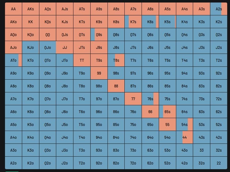 Poker preflop charts are visual guides that show you which hands to play from every position at the table. They take the guesswork out of your most frequent decision in poker: should I play this hand or fold it?