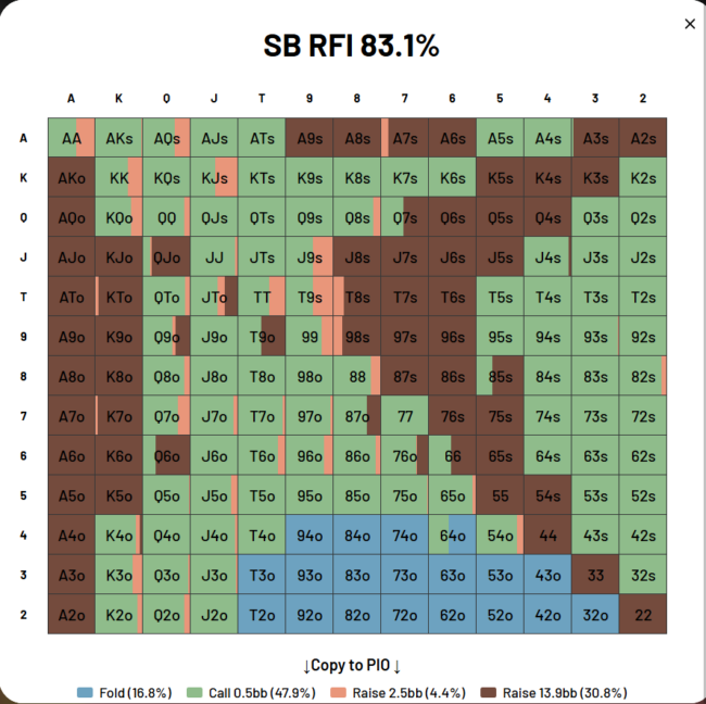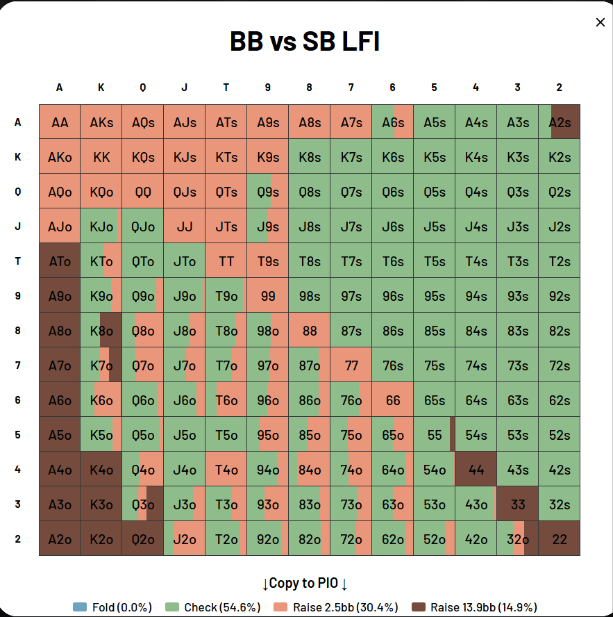 Back to Articles Short-Stack Blind vs Blind: The Complete Framework March 20, 2026 | Jordan "BBZ" Drummond Share Why Short-Stack Blind vs Blind Is Different At 100 big blinds, blind vs blind play is a postflop game. Both players have deep stacks to maneuver and the preflop decisions are relatively straightforward: the small blind either limps or raises small, the big blind defends wide, and real edge is captured on later streets. At 15-25bb the preflop structure changes in a specific and important way. The standard small blind raise now works alongside a meaningful open jam option. Limping remains a significant part of the small blind’s strategy at all stack depths, but at short stacks the question is no longer “raise, limp, or fold.” It is “raise, jam, limp, or fold,” and the hands that fall on either side of those lines are determined by precise thresholds. The core reason open-jamming matters at short stacks is geometric. When the small blind jams for 15-25bb into a pot of around 2.5bb, they risk their entire stack to win a small amount uncontested. Many hands are too strong to fold preflop but not strong enough to commit all-in. Those hands limp or raise small, with a different set of hands on each side of every threshold depending on the depth. For a full treatment of full-stack blind vs blind principles, see The Complete Guide to Blind vs Blind Play. Small Blind Open Jam Thresholds at 15-25bb Open jam thresholds tell you the maximum stack depth at which jamming is your best option against the big blind’s calling range. A practical way to think about them: if a hand’s jam threshold is 17bb and you are playing at 15bb, the stack is below that threshold and jamming is correct. At 20bb the stack is above the threshold and the hand moves out of the jam range. A significant portion of the small blind range raises small at 15-25bb rather than jamming. This raise range is relatively linear, covering a broad spread of strong hands. At 14bb it includes strong pairs (AA through 99), the top suited Ax hands (AKs through ATs), the strongest suited Kx hands (KQs, KJs, KTs), and the top offsuit Broadway combos (AKo, AQo, AJo, ATo, KQo). The big blind has positional advantage and calls wide, so the small blind raises hands that play well postflop and extract value across a broad calling range. Jamming these hands folds out too many of the hands they beat or dominate. The largest single block of the open jam range at 15bb is offsuit Ax hands. A9o through A2o all jam at 14bb, and most remain in the jam range into 20bb before beginning to migrate toward limp or raise. These hands have reasonable equity against the big blind’s calling range but cannot realize that equity efficiently when playing out of position postflop. Offsuit hands lack the flush draw and backdoor flush draw equity that allows suited hands to defend flops and turns from OOP, so jamming and resolving the hand preflop produces more chip EV than raising and navigating postflop. Pairs from 22 through 66 jam at 14bb for the same structural reason: an underpair is difficult to play from out of position postflop, and jamming avoids that problem entirely. Pairs 77 and 88 have passed their open jam threshold at 14bb and move into the limp-rejam range. Pairs 99 and TT raise small because their equity is strong enough to benefit from postflop action. This equity realization logic is why the jam range skews so heavily toward offsuit combos rather than suited hands of equivalent raw equity. T9s has a jam threshold of 8bb. At 15bb it has moved into the limping range, not because its raw equity has declined but because it has enough stack to realize equity postflop. Its flush draw and connectivity give it tools to play flops and turns that an offsuit hand never has. A5s follows the same logic at 10bb. BBZ’s threshold data, developed from GTO equilibrium analysis and covered extensively in the Daily Seminars, shows exactly where each hand sits at each stack depth and how the ranges shift as stacks deepen. The Limp-Fold, Limp-Call, and Limp-Rejam Framework Once a hand has exceeded its jam threshold and does not belong in the raise range, it falls into the limping portion of the small blind’s strategy. But limping is not a single action — it is a category containing three distinct sub-strategies: limp-fold, limp-call, and limp-rejam. Treating them interchangeably is one of the most common short-stack blind vs blind mistakes. Limp-Fold Limp-fold hands are genuinely weak holdings that want to see a cheap flop but do not have enough equity or playability to continue against aggression. Hands like 75o, 85o, and similar low disconnected combos fall here. Facing a raise from the big blind, they fold and preserve the stack. Limp-Call Limp-call hands have enough equity against the big blind’s raising range to justify calling and playing postflop. The suited limp-call range covers nearly the entire suited hand spectrum. The small blind folds only the weakest suited holdings — roughly 62s through 92s and 73s through 83s — and defends everything above T2s. On the offsuit side, hands like offsuit 8x and offsuit 7x limp-call while weaker offsuit hands fold. A useful frame for players familiar with button opening ranges: the structure is similar. The button opens offsuit 8x and suited 5x; the small blind limp-calls offsuit 8x and suited hands down to roughly 4x. The range construction is comparable — the difference is position and preflop action, not the underlying hand selection logic. Limp-Rejam Limp-rejam hands are too strong to fold preflop but have exceeded their jam threshold at the current depth. Medium pocket pairs are the primary limp-rejam hands across the 15-25bb range, with rejam thresholds against a big blind raise running to 40-45bb — meaning they profitably shove over any raise. A hand like 77 does not limp hoping to call and play postflop. It limps specifically to get all the chips in when the big blind raises. The 