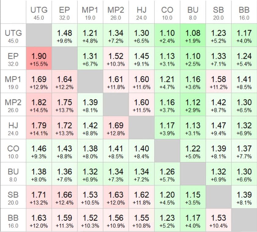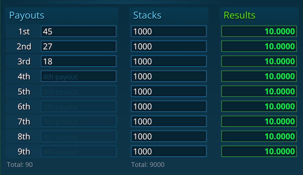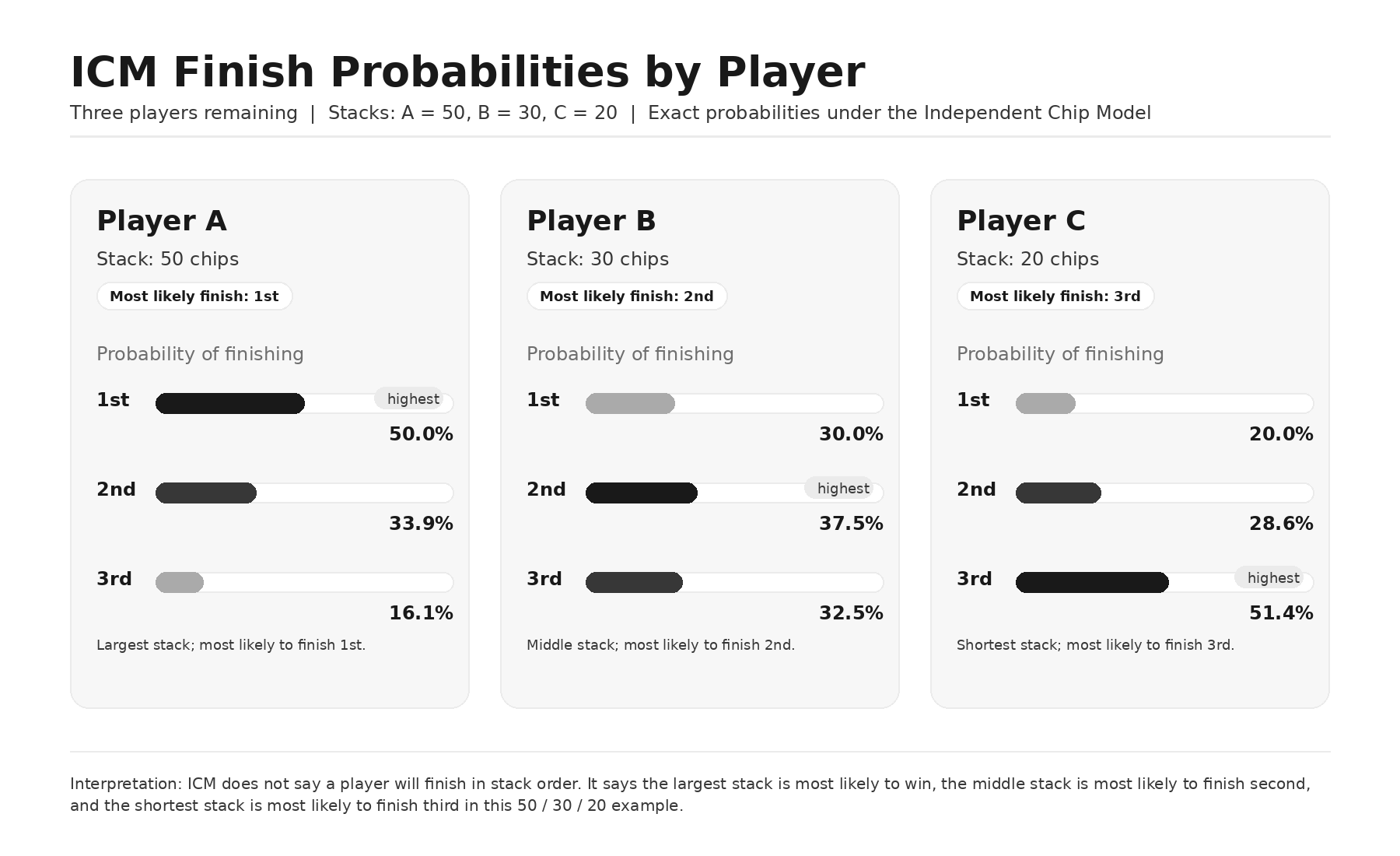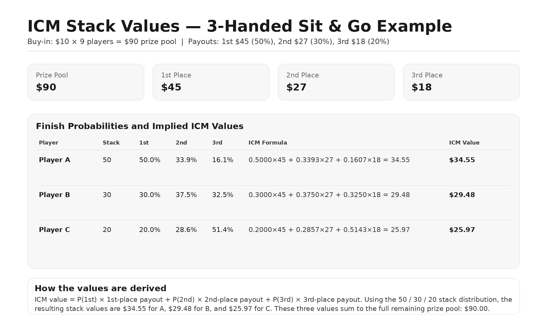 Back to Articles The Complete Guide to Independent Chip Model (ICM) April 9, 2026 Share What Is ICM in Poker? The Independent Chip Model (ICM) is one of the most important pillars in modern tournament poker strategy, and one of the most frequently misunderstood. At face value, tournaments appear to reward the players who accumulate chips most effectively across stack depths. And while winning tournament strategy isn’t less than a strong chip EV game, it is certainly more. Unlike cash games, tournaments are shaped by payout structures, elimination risk, and shifting stack distributions, all of which affect the real-money value of chips. Under ICM, the value of winning chips is not the same as the cost of losing them. That is why statically applying cEV strategy at every stage of a tournament is a costly mistake, even when executed well. To perform at a high level in MTTs, players must understand not only how to accumulate chips, but how tournament equity changes as the game progresses. This guide explains what ICM is, why it matters, how it is measured, what drives it, and how strategy adjusts in response. ICM in Poker ICM stands for the Independent Chip Model, also known as the Malmuth-Harville method. It is a model used to estimate each player’s share of the remaining prize pool based on the current stack distribution. The underlying idea predates poker. In 1973, David Harville published a method for converting win probabilities into finish-position probabilities in horse racing. His model begins with each entrant’s chance of winning, then derives the probabilities of finishing 1st, 2nd, 3rd, and so on. Mason Malmuth later adapted that logic to poker tournaments. By using chip stacks to estimate finish probabilities and then applying the payout structure, he showed how a stack could be converted into tournament equity, the real-money value of that stack. This was a major step in the development of MTT theory. Harville’s model, and Malmuth’s adaptation of it, helped move tournament poker toward a more rigorous and quantitative framework. That framework still shapes modern tournament strategy today, including in the solver era. The figure below illustrates how ICM works. The most likely finish for each player is also the most intuitive. The chip leader is most likely to win outright. The second-largest stack is most likely to finish second. The shortest stack is most likely to finish third. But being most likely to finish in a particular position is not the same as always finishing there. ICM accounts for that uncertainty by considering every possible finishing outcome and weighting each one by its probability. For that reason, a tournament stack is not worth the payout of its likeliest finish, but the sum of all its possible finishes weighted by their corresponding probabilities. ICMizer Example — 3-Handed 50/30/20 Chip Distribution Three players remain. All three are paid. First place receives 50% of the prize pool, second receives 30%, and third receives 20%. The stack values shown in the right column do not correspond one-to-one with the payout for each stack’s most likely finish, shown on the left. A stack containing 50% of the chips in play is worth roughly $34.50 in equity, or about 38% of the prize pool — not 50%. A stack containing 30% of the chips in play is worth roughly 32.75% of the prize pool. A stack containing 20% of the chips in play is worth roughly 28.5% of the prize pool. Figure – How ICM values are calculated. With only three players remaining, this calculation can be done manually. As the field grows, however, the calculations become too complex to perform by hand, which is why tools such as ICMizer and Holdem Resources Calculator (HRC) are used in practice. Final Tables! ICM Preflop Charts & Trainer 254 Different ICM solutions (Final Table, ITM, Pre-ITM, ITM Bubble, Satellites) Chart View Range View Trainer Cancel at any time $12.5/mo $15/mo Billed annually Best Value Billed monthly More detailsAdd to cart Why ICM Matters in MTTs ICM was developed to weigh risk and reward in poker tournaments. In cash games, a simple EV calculation serves that purpose. But tournaments are not cash games. They are a different format with different economics. Cash Games vs. MTTs In cash games, chips have linear dollar value. If you sit down in a live $5/$5 cash game and buy in for 100 big blinds, you exchange $500 in cash for $500 in chips. Whether you win or lose, you cash out for an amount equal to the value of your stack at the end of the session. In that environment, chips won or lost are equal to dollars won or lost. Maximizing chip EV is the game. Tournaments work differently. You do not exchange money directly for chips with standalone cash value. You buy entry into a contest that comes with a starting stack, a blind structure, and a payout structure. That difference in format is what creates the need for a model like ICM. Tournament players cannot cash out when their stack grows or shrinks. They are committed until they are eliminated or the tournament ends. But the fact that tournament chips cannot be redeemed on demand does not mean they have no real-money value. They do. That value is conditional on the payout structure and the distribution of the remaining chips. Tournament Equity Under ICM, chip stacks are viewed through a tournament equity lens. Every live stack has a claim on a share of the remaining prize pool. At the start of a tournament, each player has contributed the same amount to the prize pool and received the same number of chips. When the first hand is dealt, the field is level. Each player’s stack and investment are proportional to the others, so each player begins with the same tournament equity. Example: 9-player $10 Sit & Go (SnG, no fees) Each player starts with 1,000 chips. Three players are paid. First place receives 50% of the prize pool, second receives 30%, and third receives 20%. Each player begins with $10 in tournament equity,