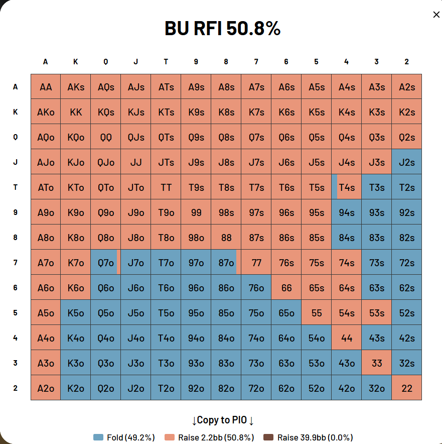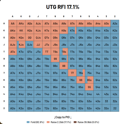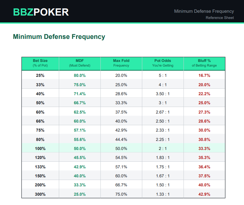 Back to Articles What Are Poker Ranges? Key Poker Terms Every Tournament Player Should Know April 5, 2026 | Jordan "BBZ" Drummond Share Everything Starts With a Range Poker ranges are the single most important concept in tournament poker strategy. If you have watched training content, read strategy articles, or listened to serious players discuss a hand, the word “range” appears in almost every sentence. Understanding what poker ranges are, how they work, and how the concepts around them fit together is the fastest way to start thinking about the game the way winning players do. This guide covers ranges in depth, then explains the 12 terms that give ranges their full meaning. If you are brand new to the game and need to get comfortable with hand rankings, positions, and basic rules first, start with our complete beginner’s guide to No-Limit Texas Holdem. This guide picks up where that one leaves off. What Are Poker Ranges? A poker range is the full set of hands a player could reasonably hold in a given situation. When your opponent raises from early position, they are not holding one specific hand. They are holding some distribution of hands: pocket aces some percentage of the time, ace-king some percentage of the time, jacks some percentage of the time, and so on. That entire collection of possible holdings is their range. Recreational players and weaker pros tend to think about poker hand by hand, trying to guess exactly which two cards their opponent holds. Winning players tend to think in ranges. Rather than asking “does my opponent have aces or kings?”, the question becomes “what is the full range of hands my opponent could have here, and how does my range interact with that one?” This shift in thinking changes everything about how you approach every street, every bet size, and every decision. Every decision in No-Limit Hold’em is a range-versus-range decision. A bet that looks profitable against one specific holding might be a mistake against the full range. A fold that seems obvious against the nuts might be a significant error when you account for all the weaker hands your opponent could also hold in the same situation. Ranges are the foundation of the decision making process, not individual hands. How Poker Ranges Are Visualized Ranges are displayed on a 13×13 hand matrix containing all 169 unique starting hand combinations. Pocket pairs run diagonally from aces in the top-left to deuces in the bottom-right. Suited hands occupy the upper-right triangle of the grid. Offsuit hands occupy the lower-left triangle. Each cell represents one hand type, and the grid gives you an instant visual picture of a range’s shape and size. In BBZ’s preflop range charts, each cell is color-coded by action: raise, jam, limp, or fold. When you look at a full range image, you are seeing exactly which hands take which actions and at what frequencies. A cell that is partially colored shows a mixed strategy, meaning the hand plays one action some percentage of the time and another action the rest. This is how GTO equilibrium strategies work: some hands do not have a single pure action but a distribution across multiple options indicating that the hand can be played in multiple ways for the same EV. How Ranges Differ by Position Position is the most important driver of a preflop range. Players in later positions act after their opponents on every postflop street, which gives them an informational advantage. Because of this advantage, late position players can profitably play a wider range of hands. The button opens 50.8% of hands at 40 big blinds. Under the gun opens 17.1%. The range widens in a structured, predictable way as you move from early position toward the button. The two charts below illustrate what we’re talking about. The button range covers most of the matrix: many suited hands, all pocket pairs, and a wide spread of offsuit broadways and connectors. The under-the-gun range is a tight cluster in the top portion of the grid, limited to the strongest hands that can withstand action from seven players still to act. Same game, same stack depth, completely different ranges. BU raise-first-in range at 40bb. Raise 2.2bb: 50.8%, Fold: 49.2%. Pink cells raise, blue cells fold. Source: BBZ Poker Charts. UTG raise-first-in range at 40bb. Raise 2.2bb: 17.1%, Fold: 82.9%. The range contracts sharply with seven players left to act. Source: BBZ Poker Charts. This positional logic runs through every street. A hand that plays well in position because you can control the pot and react to your opponent’s actions may be unprofitable out of position because you are forced to act first without information. As an example, bluffing after an opponent weakens their range with a check is often a much more profitable play than bluffing prior to having obtained that information. Understanding which hands realize their value only with positional advantage is one of the most practical extensions of thinking bigger about both your range and the scenario you are in as opposed to narrowly thinking about your hand. For a complete breakdown of opening ranges by position with specific hand examples and the Rule of 5-6-7-8-9-10 mnemonic, see our Guide to Preflop Ranges for Tournament Poker by Position. How Ranges Narrow Through a Hand Every action a player takes eliminates some hands from their possible range. This is called range narrowing, and it is the foundation of hand reading. Before the flop, a player raising from under the gun holds 17.1% of all hands. After they bet the flop, check-call the turn, and lead the river, their range has been narrowed down dramatically by three rounds of action. Each decision they made removed some holdings from the set of hands they could plausibly have. A player who raised preflop, bet the flop on a queen-high board, fired again on a blank turn, and then shoved the river no longer has a range that includes as many weak hands. Many weak hands might have checked at so